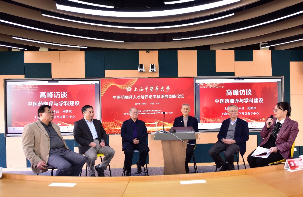 高峰访谈中,分别来自上海市多所高校的庄智象、丁年青、潘文国、何刚强、柴明颎教授,从学科定位、跨学科发展、项目建设、理论应用等视角阐述对于中医翻译学科发展和人才培养的观点和见解,并回答了现场师生的提问,引发了阵阵掌声。