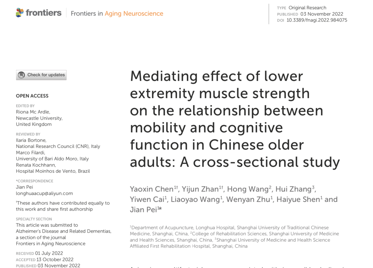 在过去的十年中,临床研究显示身体和认知的同时衰退会导致不良后果,并提出了运动性认知风险综合征(MCR)来定义同时存在的身体和认知衰退状况。近年来,龙华医院针灸科主任裴建教授(通讯作者)带领陈瑶鑫博士(第一作者)等多中心研究团队,观察下肢肌肉力量作为中介变量影响移动能力对认知功能作用的一项研究,相关成果发表于11月3日发布在Frontiers in Aging Neuroscience期刊。