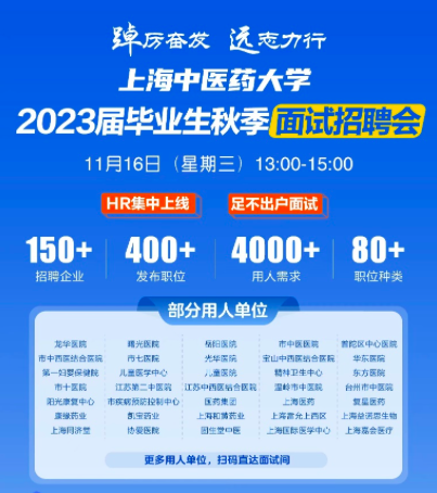 “历年入职和黄药业的上中医学生里,已有多位发展成为中高层管理人才,今年我们对上中医培养的人才更是求贤若渴,期待更多优秀人才的加入,一起为中医药事业添砖加瓦!”上海和黄药业有限公司、上海高校学生职业生涯发展教育校外实践基地的校园招聘负责人施燕表示。本次参会用人单位中有30余家校董企业、校院两级岐黄育人实践基地,提供200多个岗位,当天约90名毕业生通过初面试达成就业意向。