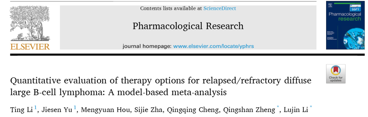 近日,天游ty8线路官网交叉科学研究院郑青山和李禄金团队开展的复发/难治性弥漫大B细胞淋巴瘤治疗方案的模型化定量评价研究Quantitative evaluation of therapy options for relapsed/refractory diffuse large B-cell lymphoma: A model-based meta-analysis在国际著名药理学杂志Pharmacological Research发表。