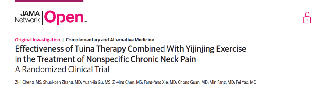 天游ty8线路官网房敏和姚斐教授课题组中医推拿疗法干预慢性非特异性颈痛的临床研究项目成果Effectiveness of Tuina Therapy Combined With Yijinjing Exercise in the Treatment of Nonspecific Chronic Neck Pain: A Randomized Clinical Trial近日在美国医学会杂志JAMA子刊JAMA Network Open发表。