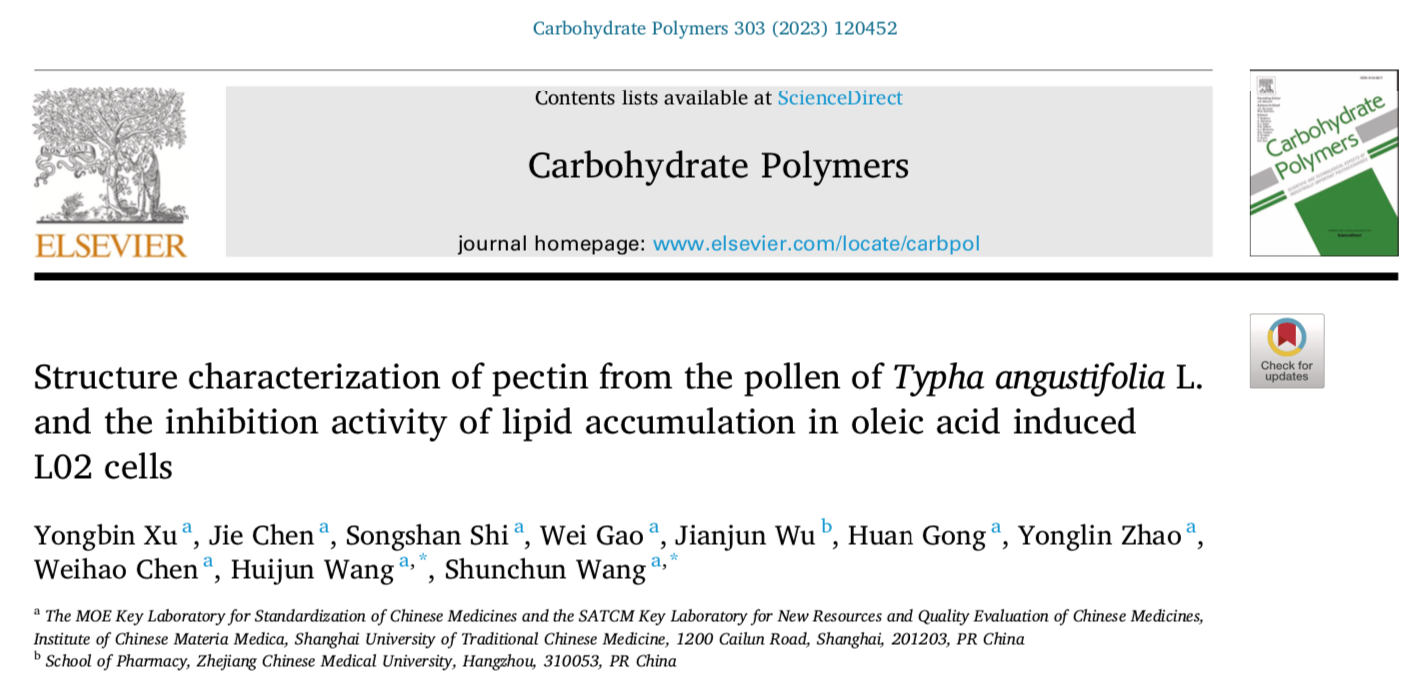 近日,天游ty8线路官网中药研究所王顺春和王辉俊团队在化学一区TOP期刊Carbohydrate Polymers发表揭示中药蒲黄中RG-I型果胶多糖在降脂作用方面的最新研究成果Structure characterization of pectin from the pollen of Typha angustifolia L. and the inhibition activity of lipid accumulation in oleic acid induced L02 cells,该论文从中药蒲黄中提取得到一种新的RG-I型果胶多糖,并在油酸诱导的L02细胞模型中研究发现具有潜在的降脂作用。
