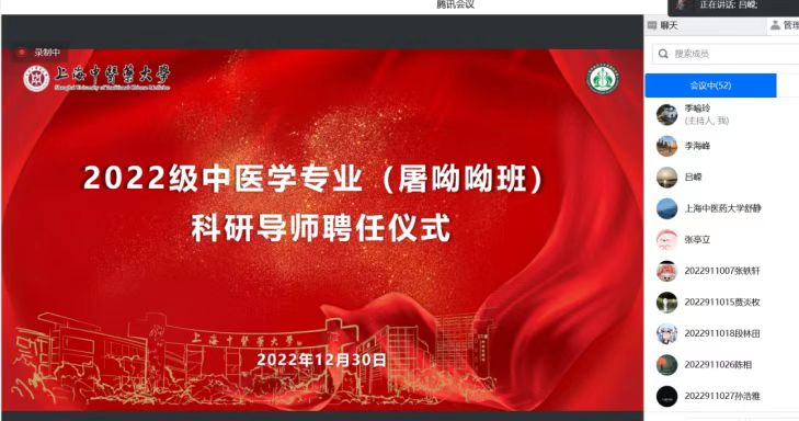 12月30日下午,天游ty8线路官网2022级中医学专业(屠呦呦班)科研导师聘任仪式在线举行。副校长舒静,教务处处长张亭立,曙光医院副院长仇菲,基础医学院党政班子,以及科研导师、学生等五十余人参加会议。会议由基础医学院院长吕嵘主持。