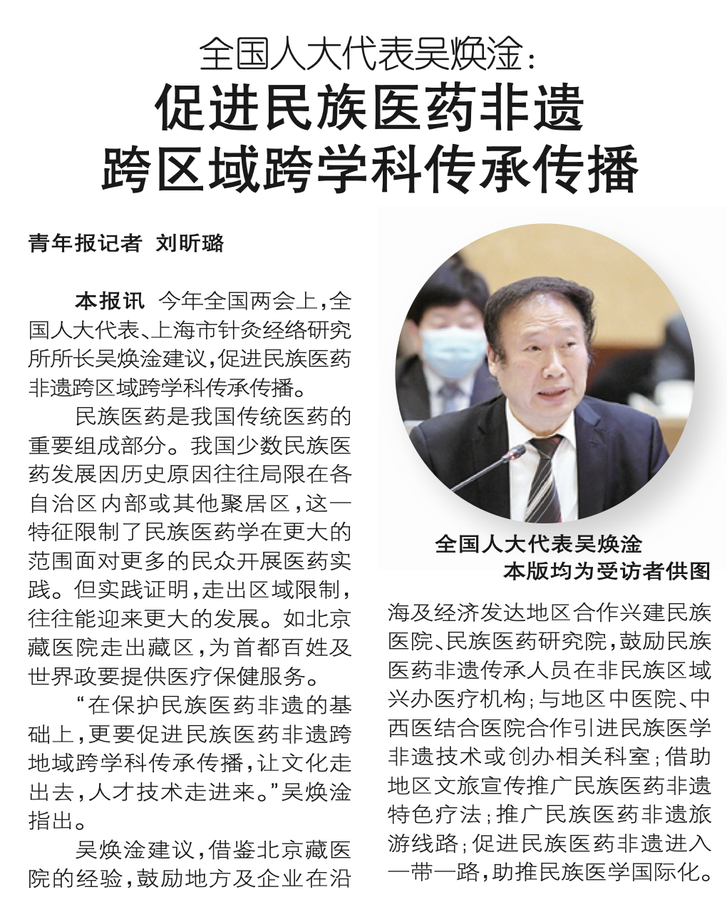 青年报:全国人大代表吴焕淦:促进民族医药非遗跨区域跨学科传承传播
