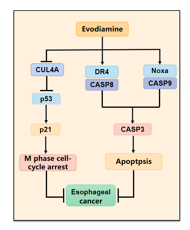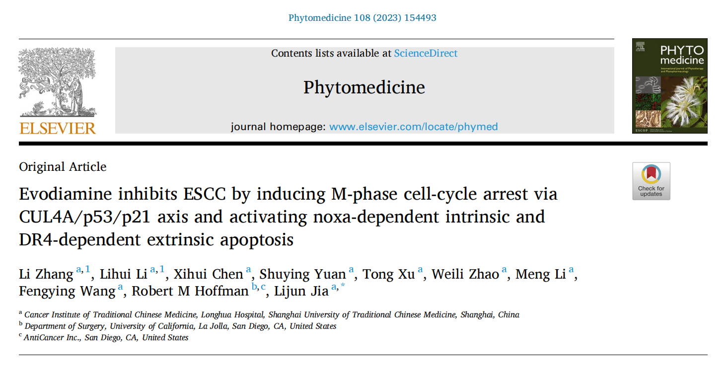 天游ty8线路检测中心登录附属龙华医院、上海市中医药研究院中医肿瘤研究所贾立军教授团队选取中药吴茱萸中主要活性成分——吴茱萸碱(Evodiamine,Evo),针对其抗食管癌效果及相关的分子调控机制,开展了深入研究。近期,团队以研究论文形式在国际权威期刊Phytomedicine上发表了最新研究成果Evodiamine inhibits ESCC by inducing M-phase cell-cycle arrest via CUL4A/p53/p21 axis and activating noxa-dependent intrinsic and DR4-dependent extrinsic apoptosis。