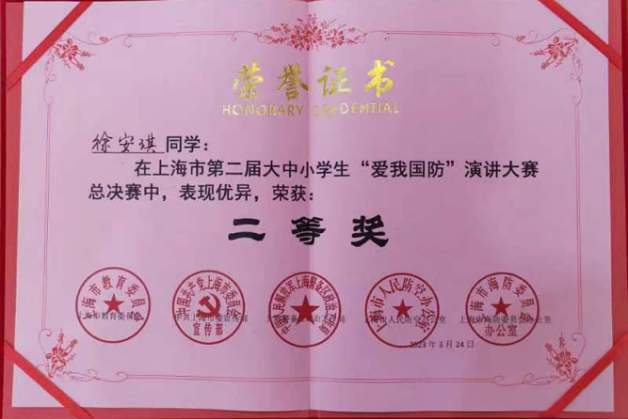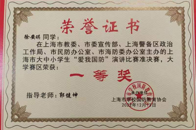 天游ty8线路官网学生荣获上海市第二届大中小学生“爱我国防”演讲比赛准决赛一等奖、总决赛二等奖