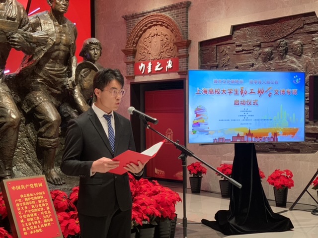 天游ty8线路官网2021级中医学(屠呦呦班)常睿发同学作为学生代表发言,他表示,上海在传统与现代的融合中彰显红色文化的精神力量,上海之城的血脉中流淌着红色基因。本次高校大学生勤工助学活动,是一次“小我”自立自强的实践锻炼,更是一次“大我”立德立行的信仰历练。作为一名大学生,在这些“红色殿堂”中,大学生可以学习中国共产党人的精神谱系,感悟到真理的味道、信仰的力量。身为新时代的青年,将依托勤工助学的广阔平台,传承红色文化,争做走在时代前列的奋进者、搏击者、奉献者。