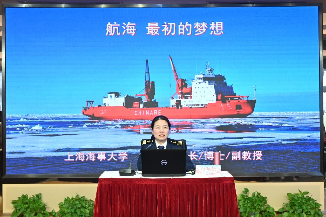 上海市三八红旗手、上海海事大学商船学院船长、博士、副教授白响恩受邀讲授她的航海之路,分享她在极地科考破冰船“雪龙号”上担当二副、作为中国首位穿越北冰洋的女航海驾驶员的真实经历和切身感悟,以及坚持热爱,让船长梦变成现实,扬帆远航、逐梦大海的神奇人生旅程。与会师生深受启发和鼓舞,表示将不负嘱托、奋楫笃行,将用奋斗诠释初心,用专业承载使命,用实际行动落实党的二十大精神。