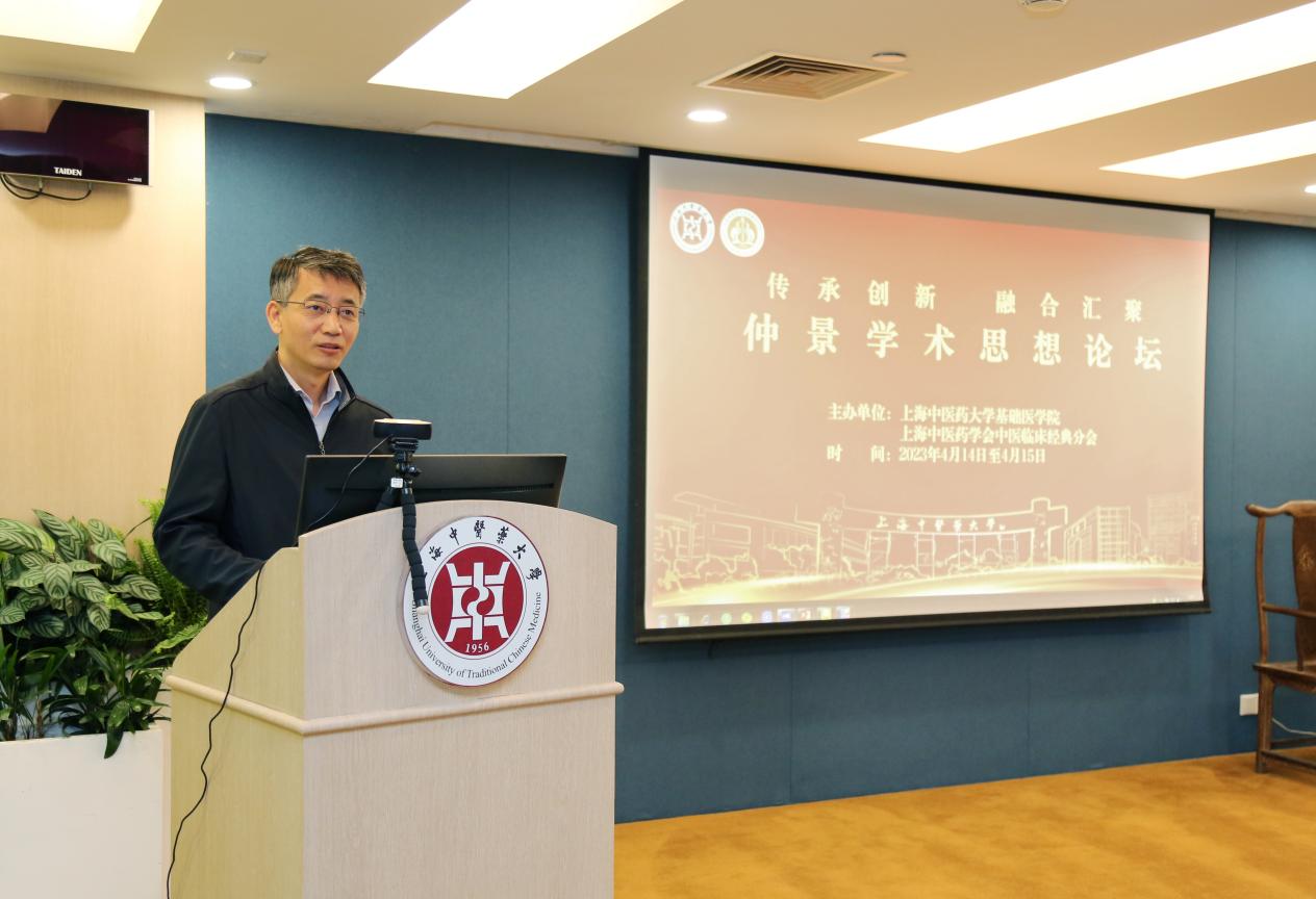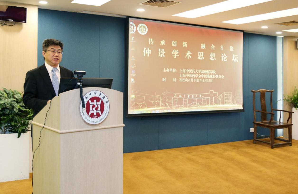 校党委副书记许铁峰致欢迎辞,他指出,在疫情期间,发挥重要救治作用的“清肺排毒汤”就是根据疫病的核心病机而选用若干经方创制而成,近日该药在加拿大获批非处方上市,得到国际社会的广泛认可。当前,如何将仲景学说继承好、发展好、利用好是中医药人的共同责任。他希望通过本次论坛,在名医名师大家们的引领下充分挖掘《伤寒论》《金匮要略》中的理论与智慧,强化中医经典在中医临床中的应用研究,促进中医临床发展,同时进一步加强对《伤寒论》《金匮要略》的研究,用现代语言阐述中医经典的科学内涵,推进其创造性转化、创新性发展,并与立德树人根本任务相结合,为熏陶、培养新一代中医药拔尖创新人才提供支撑,促进中医药文化知识传播。