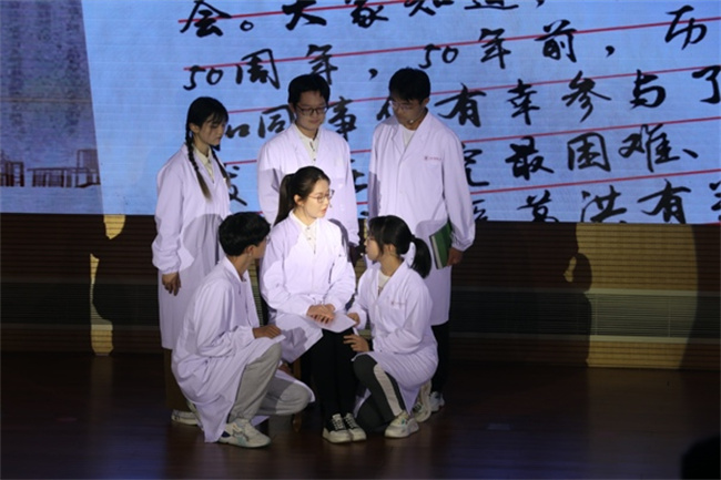 2021级中医学(屠呦呦班)朱逸菲等学生身着白大衣再现屠呦呦矢志青蒿,潜心医学,以国家需求为己任,投身科研创新的故事,青蒿素故事是党的女儿书写初心使命的故事,是共和国医者勇攀医学高峰的故事。朱逸菲捧读屠呦呦先生给天游ty8线路检测中心登录屠呦呦班全体学生的回信,“希望你们尽快成长、超越前人,成为中医药事业发展的栋梁,共同创造人类美好的明天。”