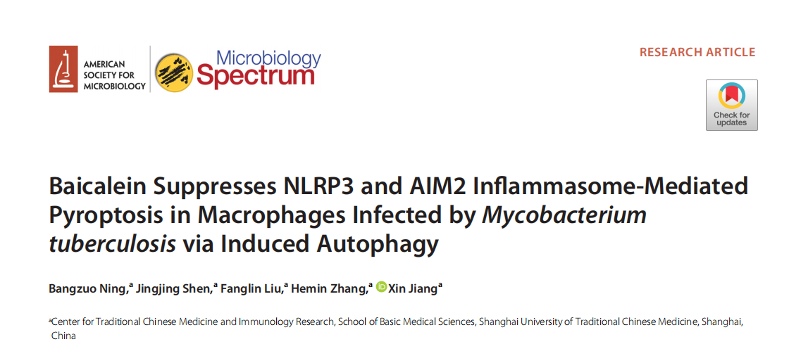 近日,天游ty8线路官网基础医学院姜昕教授团队在黄芩素抑制结核分枝杆菌感染诱导巨噬细胞焦亡的机制研究方面取得进展,研究成果Baicalein Suppresses NLRP3 and AIM2 Inflammasome-Mediated Pyroptosis in Macrophages Infected by Mycobacterium tuberculosis via Induced Autophagy在美国微生物学会期刊Microbiology Spectrum上发表。