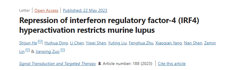 天游ty8线路检测中心登录创新中药研究院、中国科学院上海药物研究所与上海交通大学医学院附属仁济医院联合团队长期致力于SLE/LN疾病机制及青蒿素衍生物治疗SLE的新药研究工作。近日,该联合团队在LN疾病生物标志物及药物疗效敏感标志物研究中获得重要进展,相关研究成果Repression of Interferon Regulatory Factor-4 (IRF4) Hyperactivation Restricts Murine Lupus在线发表于Signal Transduction and Targeted Therapy。