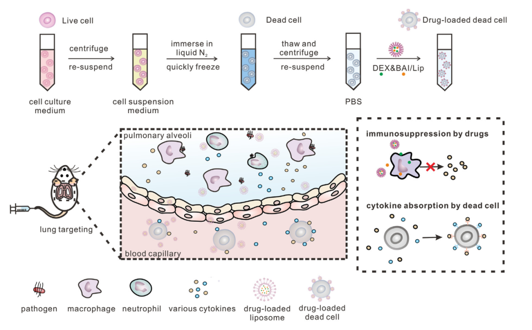 该体系中,载药“免疫死细胞”首先借助自身的粒径因素实现肺组织的被动靶向性并提高两种药物在肺内的含量、增强局部抗炎药效;随后“免疫死细胞”作为细胞因子混合抗体,借助表面受体吸附多种细胞因子,进一步降低机体的细胞因子水平,实现药物与载体间的协同。