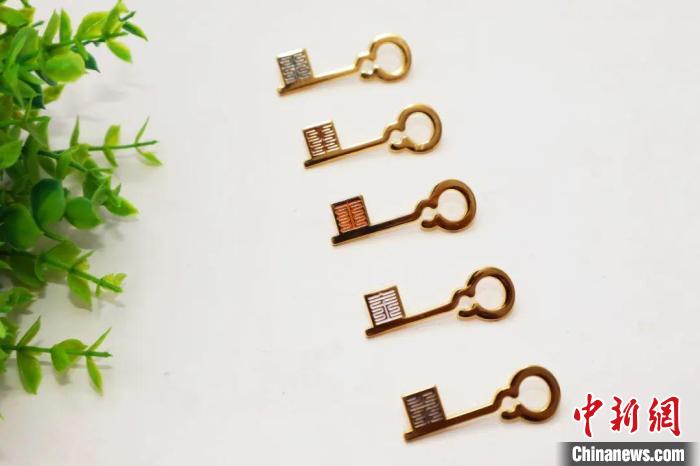五款钥匙的齿部分别以五行对应的五色为底色,采用“九叠篆”印章字体,刻以“木”“火”“土”“金”“水”字样。(天游ty8线路检测中心登录供图)