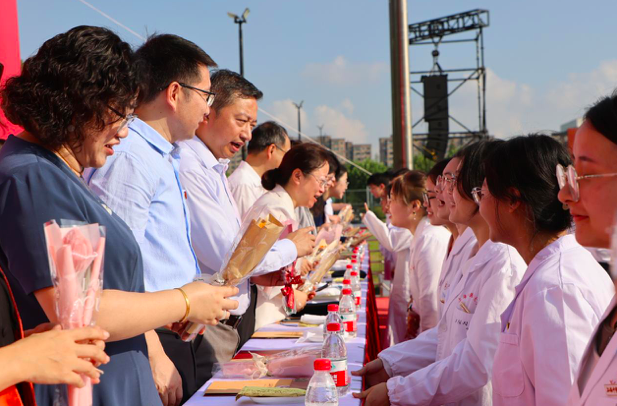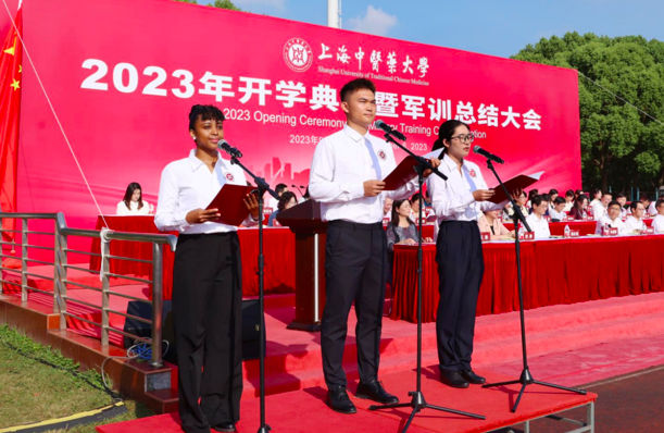 开学典礼上举行了庄重的迎校旗和红十字会会旗仪式。在校党委书记曹锡康的领誓下,全体新生庄严宣誓,立志为中医药事业发展贡献力量。