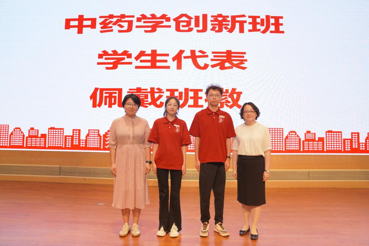 张亭立为中药学创新班授予班旗,沈漫、葛芳芳为学生代表佩戴班徽。2023级中药学创新班张凌月作为新生代表发言,表示将以“勤奋、仁爱、求实、创新”校训为引领,努力成长为能够推动中医药事业发展的优秀人才。