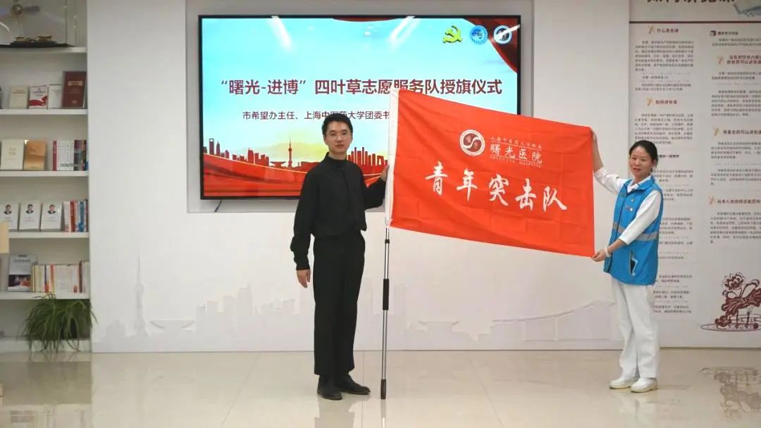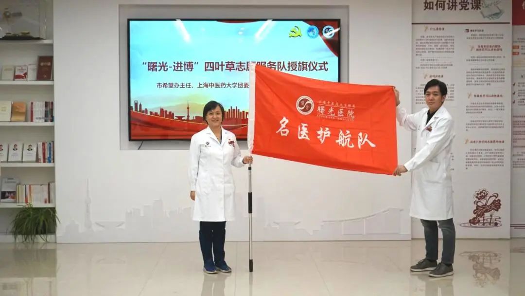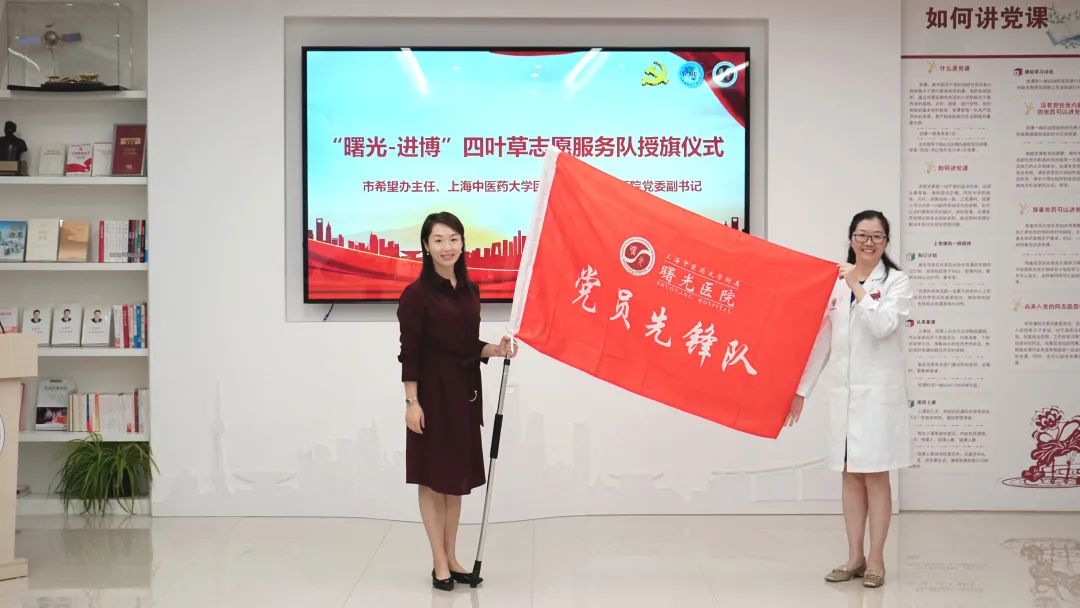 陈刘栋、万婕、郝微微分别为“曙光-进博”四叶草志愿服务队授旗。2023年,曙光医院再次集结名医护航队、党员先锋队、青年突击队三支志愿服务队伍驻守进博会。