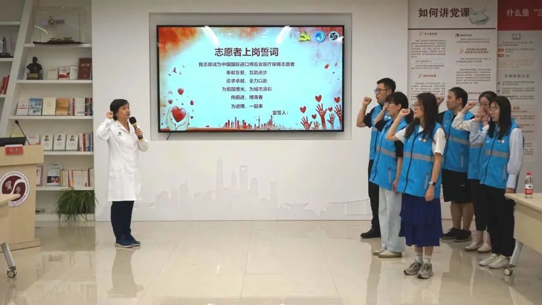 “为祖国增光,为城市添彩,向前进,博青春,为进博,一起来”,郝微微带领志愿者代表进行上岗宣誓,在声声宣誓声中,志愿者们做好了充分的岗前准备,满怀信心,用自己的专业知识和饱满的服务热情为第六届进博会的顺利开展贡献自己的力量。