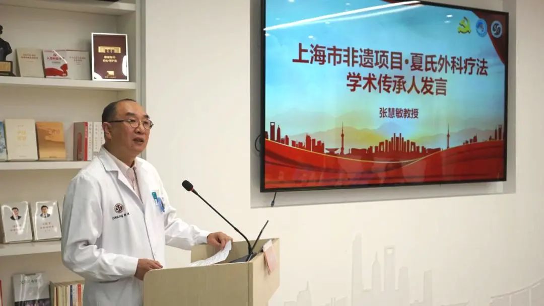 随后,吴鹏宏、周强峰、张晓天、张慧敏共同发布了第六届中国国际进口博览会“曙光-进博”非遗客厅参展项目。张慧敏介绍了夏氏外科的历史源流与学术特色,展示了进博会非遗客厅夏氏外科珍贵展品,表达了向世界宾客讲好海派中医夏氏外科的非遗故事。