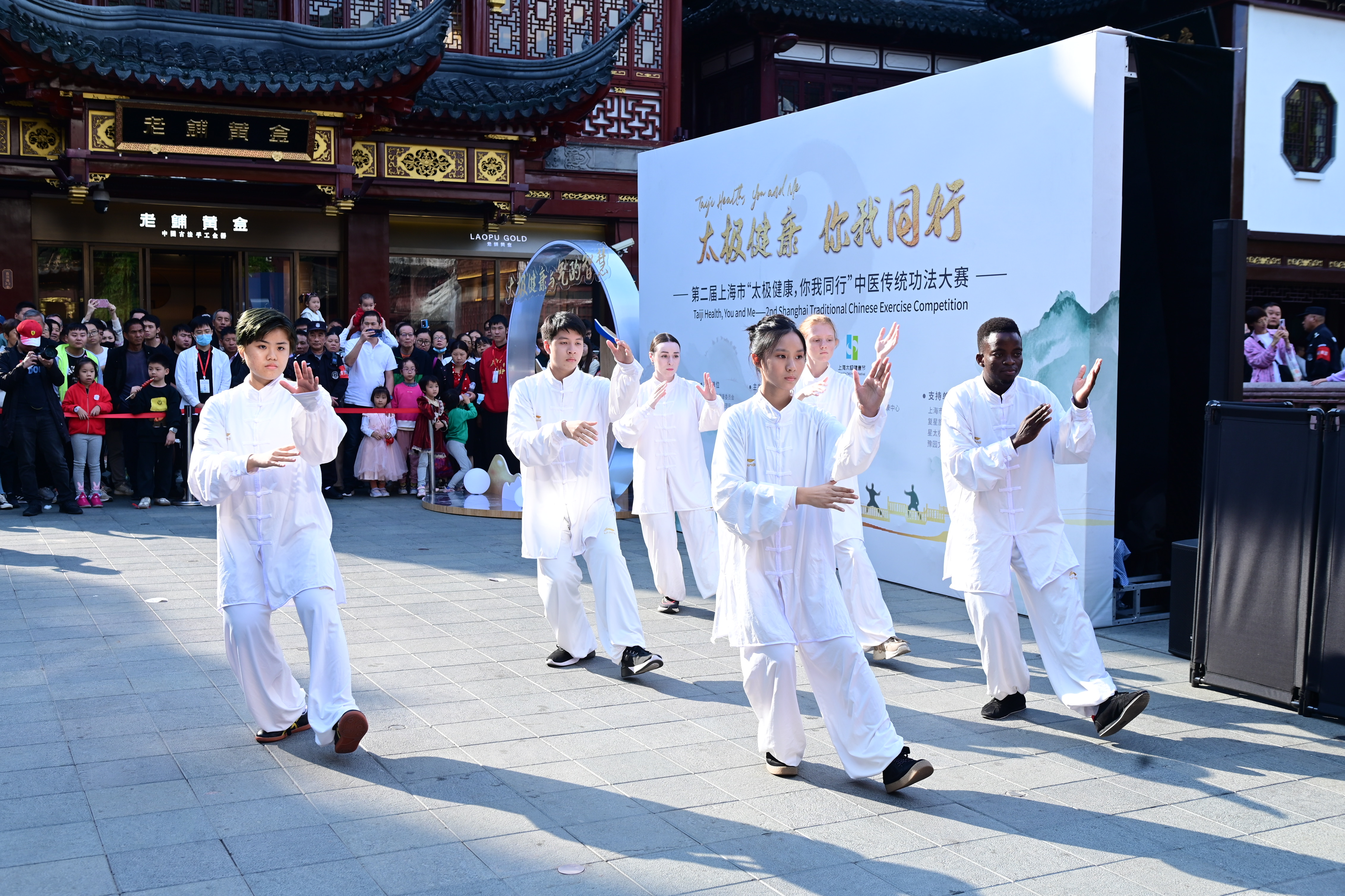 今天的海派文化地标豫园九曲桥广场游人如织,近处豫园的亭台楼阁与远处楼群摩天的陆家嘴交相辉映,在传统与现代的连接点,上海气功研究所气道书院外籍学员团队、天游ty8线路检测中心登录附属闵行蔷薇小学“五行操”团队以及复星集团旗下星太极进行传统功法展演,并与游客分享太极文化,体验非遗太极拳的抱手礼,一同感受优秀传统文化的魅力。