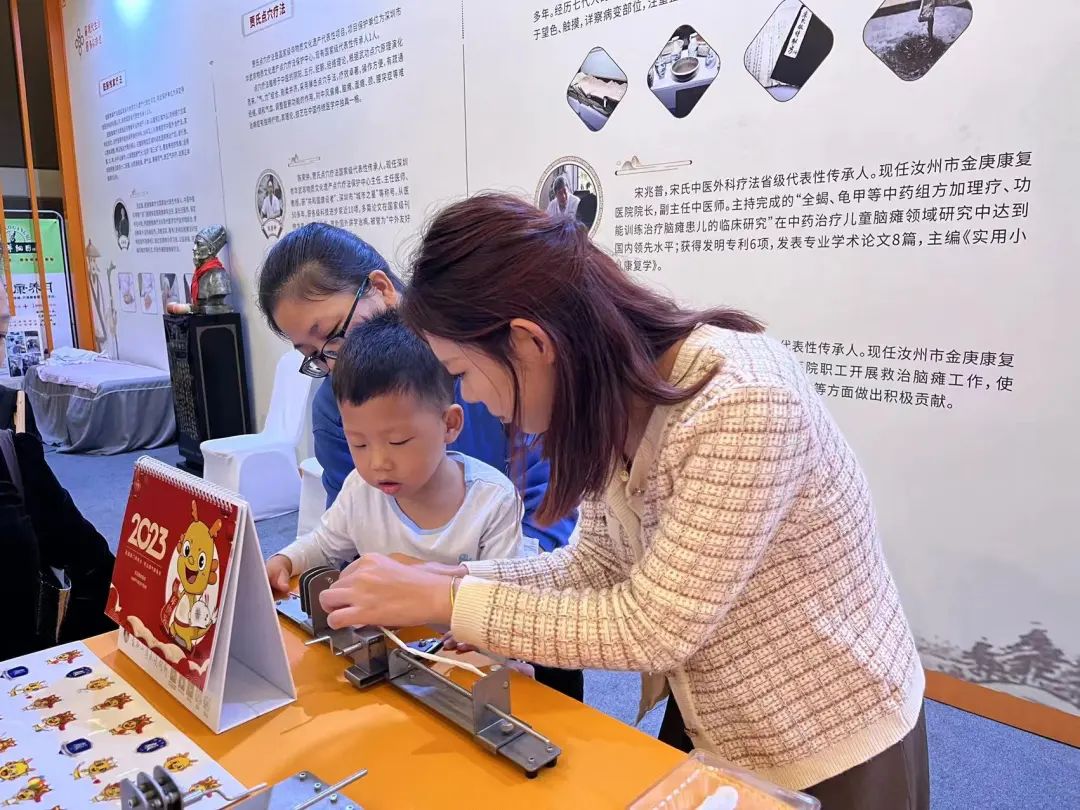 龙华医院肛肠科主任王琛带领顾氏外科肛肠医护团队参展,向来自各方的观众介绍顾氏外科百年发展历史、特色药膏制剂、药线拖线疗法、精品文创周边等。前来观展的小朋友对获得专利的折叠式药线制作装置非常感兴趣,在专业人士的指导下亲自尝试制作药线。