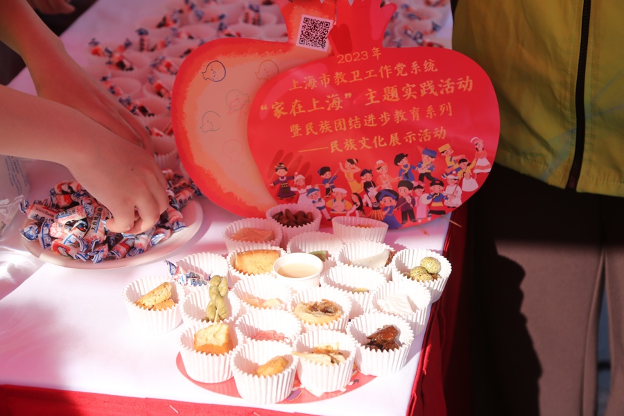 有意思的是,这个民族文化节还开辟了上海特色美食展区。大白兔奶糖、定胜糕、蝴蝶酥、上海松糕、五香豆、麦乳精等20余种琳琅满目的上海特色食品依次排开,各民族师生们纷纷品尝“上海味道”。