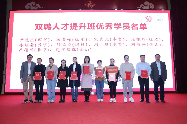 刘华和陈跃来共同为基层骨干医师双聘提升项目优秀学员颁发证书,聂爱国和龙华医院医务处处长沈亮为2022 年度基层骨干医师双聘人员颁发聘书,各区卫健委领导及龙华医院领导为各个区的上海市名中医工作室基层工作站授牌。名中医基层工作站建设是医联体建设的延续和深入,将会进一步增加龙华医院南部中医医联体建设的内涵。