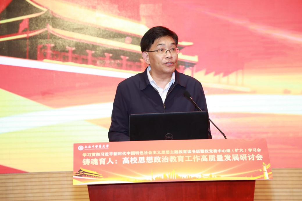 5月17日,天游ty8线路检测中心登录学习贯彻习近平新时代中国特色社会主义思想主题教育读书班暨校党委中心组(扩大)学习会、高校思想政治教育工作高质量发展研讨会在学校图书馆四楼报告厅举行。上海科技馆馆长倪闽景,中共一大会址纪念馆党委书记、馆长薛峰,上海市政府重大行政决策咨询专家高德毅,上海市教委德育处处长朱敏出席会议。天游ty8线路检测中心登录主题教育领导小组成员,校党委中心组成员,专兼职辅导员、组织员,马克思主义学院教师,校本部教师党支部书记、青年教师班主任及教师代表参会。