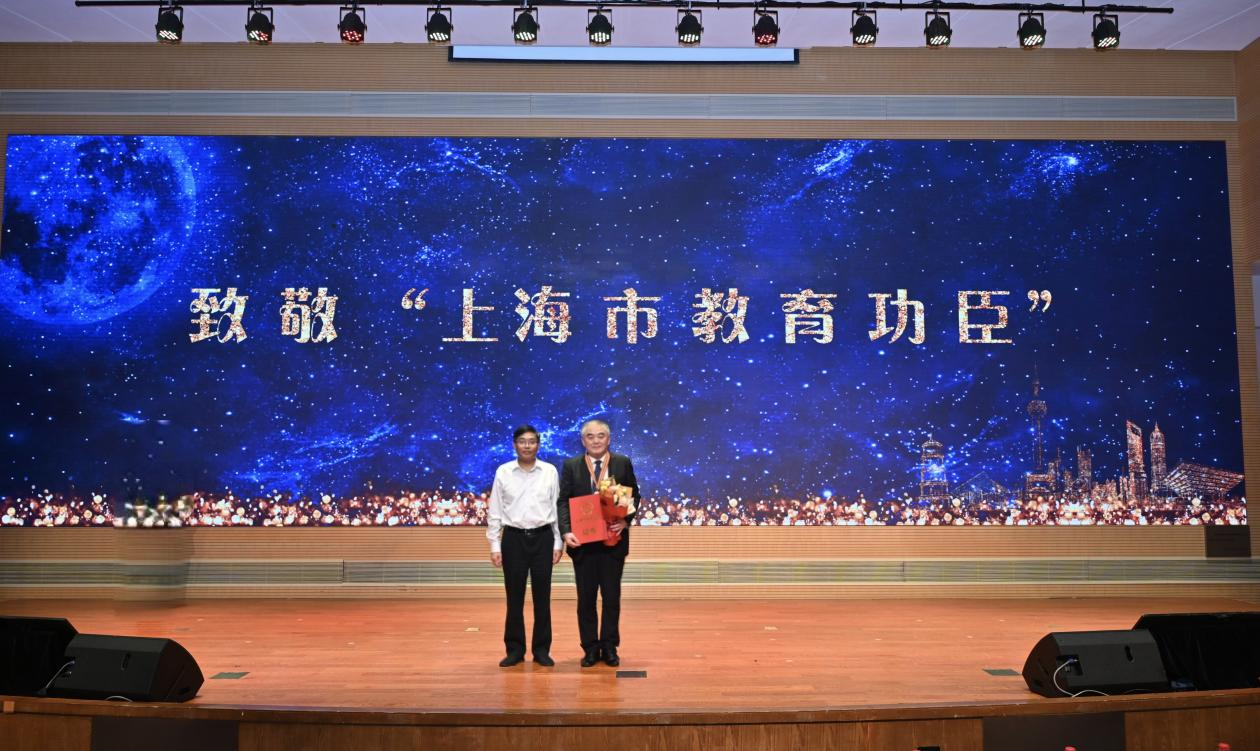 学校向从教三十年的教师代表颁授纪念奖杯。