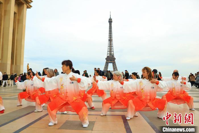 2月5日,法国巴黎,卢浮宫广场、埃菲尔铁塔、城市公园巴黎风情园……当地民众身披龙纹、起势推掌,展示太极徒手、太极扇、太极养生杖等技艺,动静结合演绎中华太极功法。