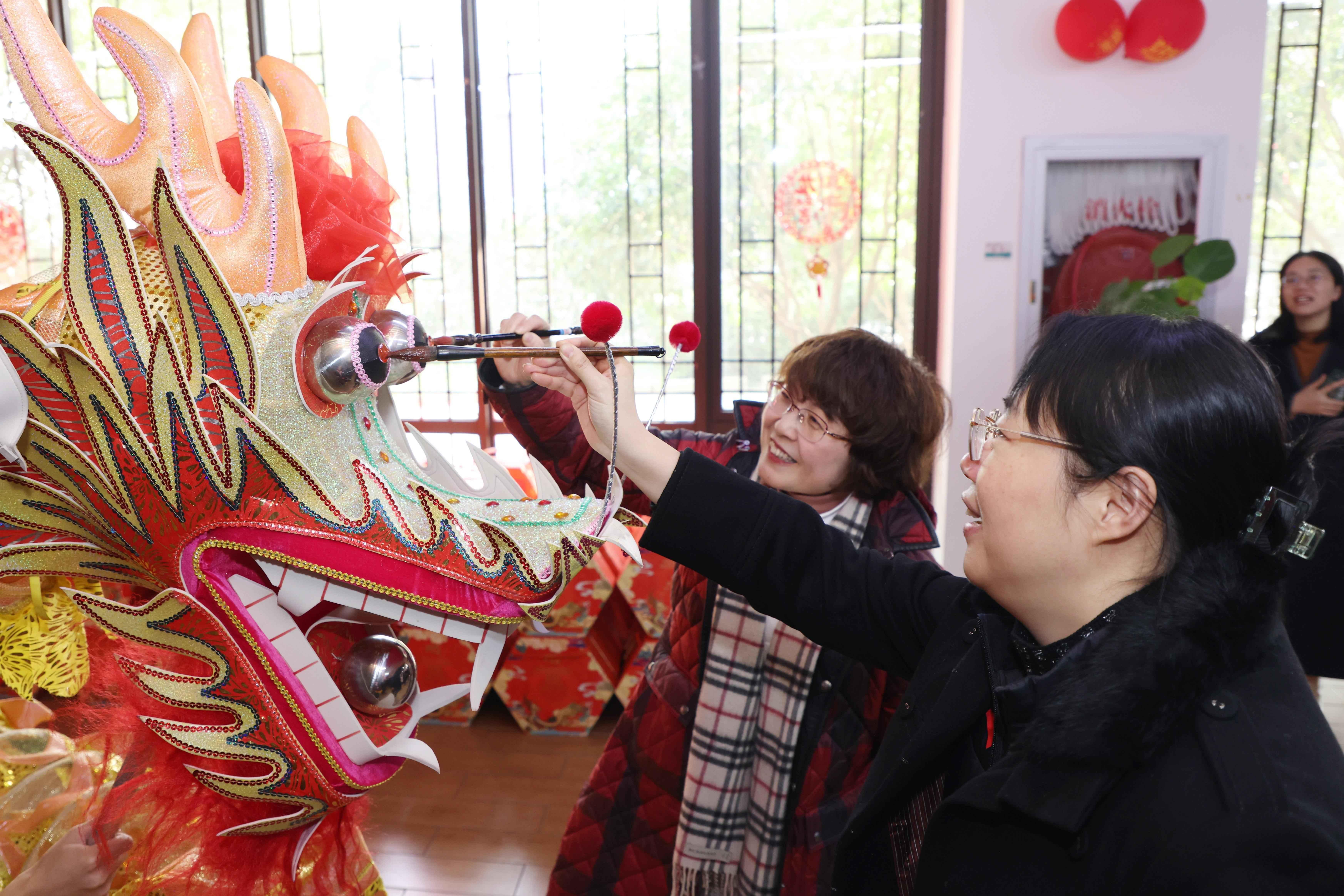 校党委副书记、副校长朱惠蓉,副校长舒静、王璐为留校学生送上新春祝福,并共同为龙头点睛,寓意对未来的美好祝福;敲响金锣,祝学子在甲辰龙年学业有成,祝老师新春伊始红火顺利,祝中医药事业欣欣向荣。