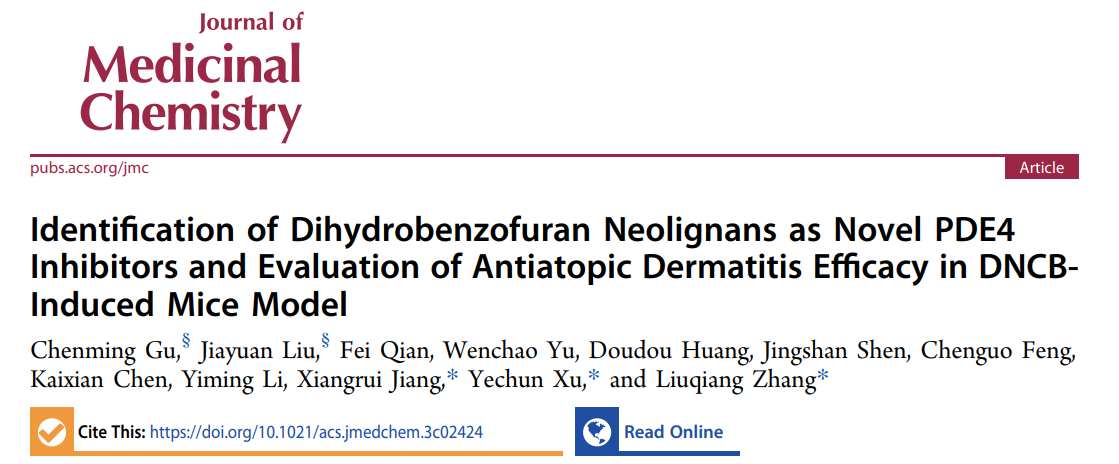 近日,中药学院李医明课题组与中国科学院上海药物研究所许叶春课题组和沈敬山课题组合作,从传统中药辛夷(Magnolia biondii)中发现并设计了二氢苯并呋喃型木脂素作为新型骨架的PDE4抑制剂用于特应性皮炎等皮肤炎症的治疗。研究成果Identification of Dihydrobenzofuran Neolignans as Novel PDE4 Inhibitors and Evaluation of Antiatopic Dermatitis Efficacy in DNCB-Induced Mice Model发表于国际药物化学Top期刊Journal of Medicinal Chemistry。