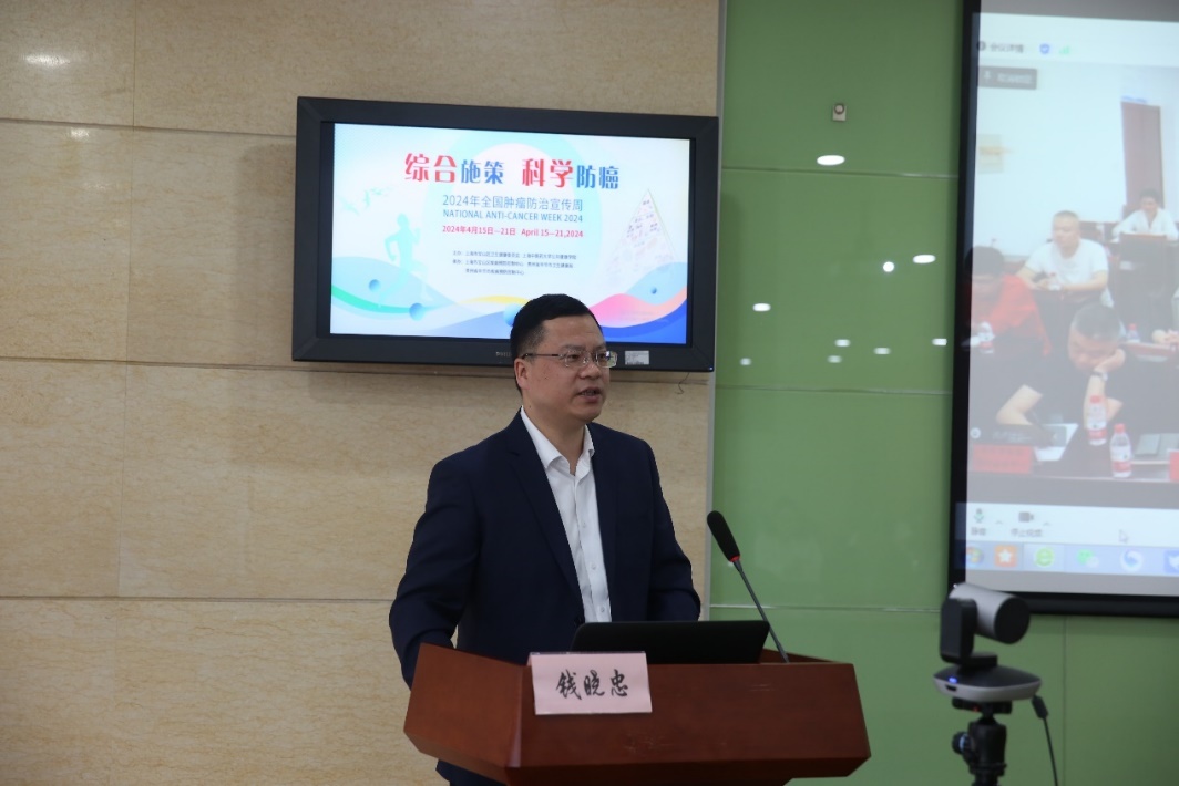 4月15日下午,由上海市宝山区卫生健康委员会和天游ty8线路检测中心登录公共健康学院主办,上海市宝山区疾病预防控制中心、贵州省毕节市卫生健康局和贵州省毕节市疾病预防控制中心承办的“沪黔联动”第30届全国肿瘤防治宣传周活动开展。活动主会场在上海市宝山区疾病预防控制中心,分会场在毕节市七星关区海子街镇卫生院。宝山区卫生健康委副主任、区疾控局局长钱晓忠,毕节市卫生健康局副局长、党组成员、疾控局局长宋少龙,天游ty8线路检测中心登录公共健康学院院长赵海磊出席启动仪式并致辞。启动仪式由宝山区疾控中心主任何凡主持。宝山区卫生健康委疾控科负责人张勤丽、宝山区疾控中心副主任孟杨、毕节市疾控中心主任刘勇、副主任王小燕,以及来自宝山区各社区卫生服务中心和毕节市疾控中心共200余位医务工作者线上线下一同参与活动。