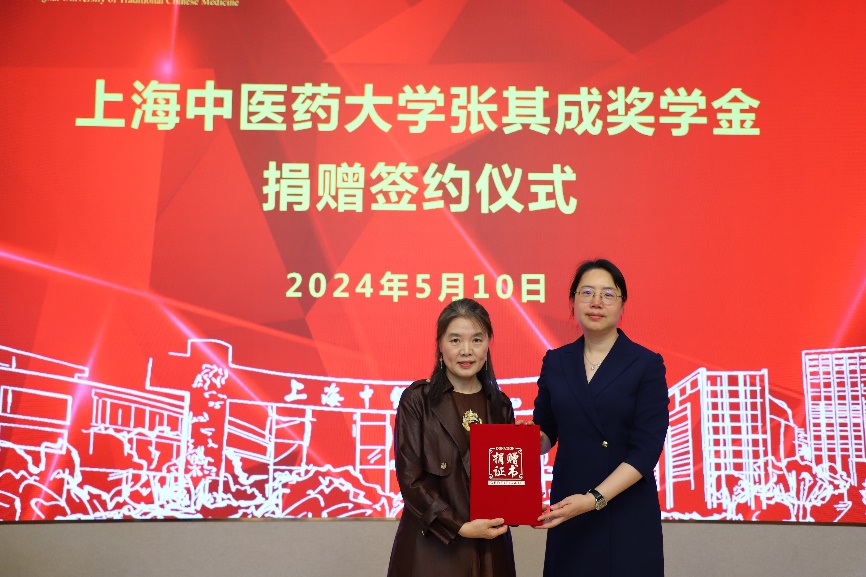 舒静向张其成与王翠莲颁发了捐赠证书与感谢状。她代表学校感谢他们助力学校事业发展和中医药文化传播的仁心善举,并表示此次捐赠将激励上中医的广大师生进一步加强在传统中医药的学习和研究,为中医药事业与中华优秀传统文化的发展作出更大贡献。