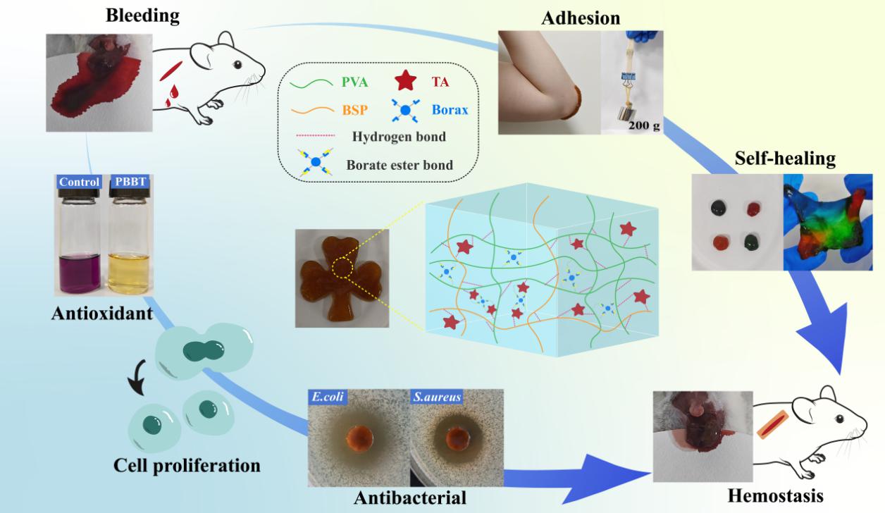 白及多糖(Bletilla striata polysaccharide,BSP)是我国传统止血敛疮药白及的主要活性成分,在生物医学领域具有广阔的应用前景。沈岚研究团队以天然多糖BSP为主要网络骨架,动态的聚乙烯醇-硼砂化学网络为另一基质体系,以单宁酸作为理化交联中心整合网络,通过简单的一锅法合成了新型双动态交联水凝胶。BSP在通过多糖结构特性担任网络骨架的同时,凭借自身良好的药理活性和生物相容性赋予了水凝胶材料体内外止血性能和安全性。新材料中动态共价硼酸酯键和可逆非共价氢键的协同作用,以及四种组分之间的合理组合使得新型水凝胶展现出增强的机械性能、组织粘附性和快速自愈性等材料特性,以及包括抑菌、抗氧化和快速止血在内的良好药效性能。作为一种出色的止血粘合剂,该新型水凝胶材料有望为解决未来急性出血、伤口愈合和其他生物医学应用问题提供一种新的解决方案。