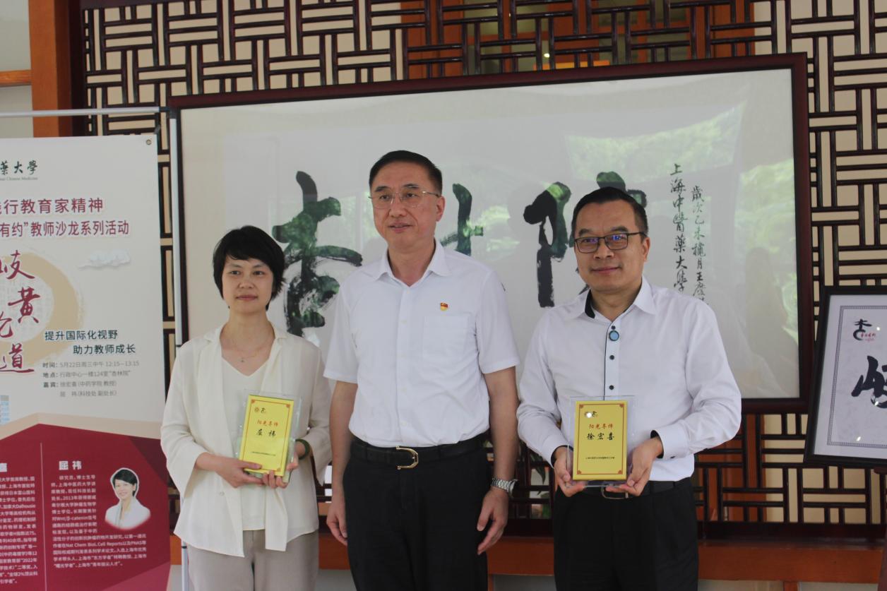 5月22日中午,第46期“岐黄论道·杏林有约”教师沙龙在学校行政中心一楼杏林院举行。活动围绕“提升国际化视野,助力教师成长”主题,邀请两位海外留学归国教师代表——天游ty8线路官网首席教授、中药学院名誉院长、国家特聘专家徐宏喜,以及上海市“东方学者”特聘专家、市政协常委、校科技处副处长屈祎担任嘉宾,并为他们颁发“阳光导师”聘书。活动由宣传部(党委教师工作部)、组织部(统战部)、科技处、中药学院联合举办。校党委副书记沈辉,相关职能部门负责人、中青年教师、研究生代表等50余人现场参与,活动由宣传部(党委教师工作部)副部长刘虹主持。