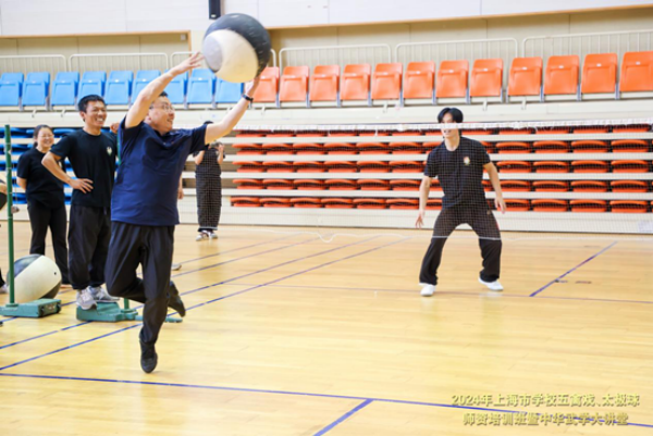 第三单元是由杨建营教学团队进行太极球技术教学实践。抛接起落间,武术教师们反复体会技术细节,感受中华优秀传统文化的魅力。经过两个小时的紧凑教学,绝大多数学员都能掌握太极球基本技术,并进行隔网对抗比赛。