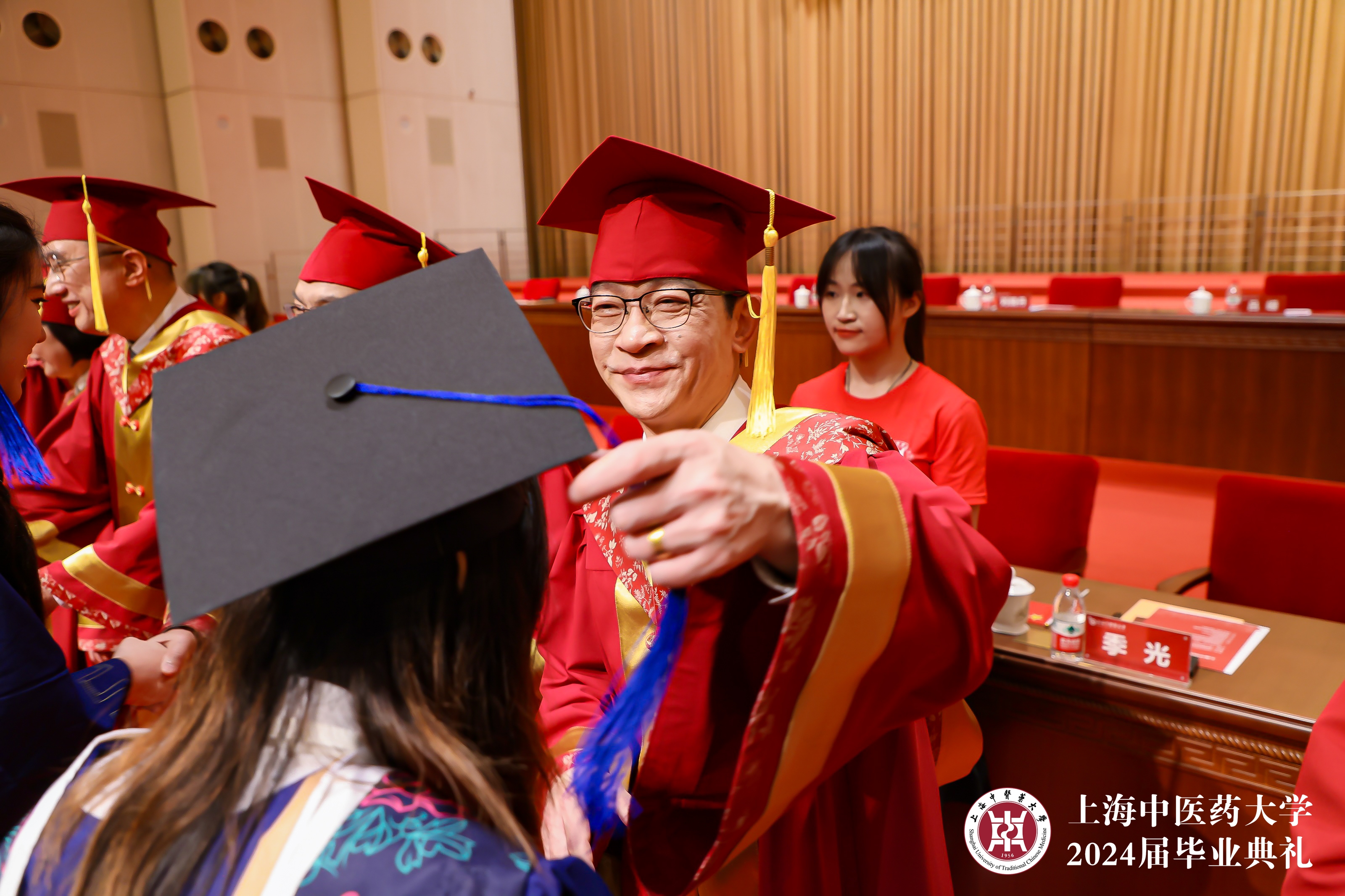 毕业典礼在庄严的国歌声中开启,2024届学生学位授予名单、优秀毕业生名单正式宣布,主席台就座的教师代表为优秀毕业生颁奖颁证、正冠拨穗。