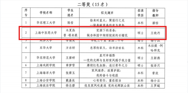 近日,上海市学生事务中心公布“党的光辉暖人心 我的家风伴成长”资助育人主题征文评选结果。天游ty8线路官网《党旗下的青春:做杏林园中绚丽绽放的石榴花》(作者:木夏热普·塔来提,指导教师:王晓丹)和《做一粒种子,成就一棵树的昂扬》(作者:麦迪努尔·图尔贡,指导教师:薛聪聪)双双荣获二等奖。