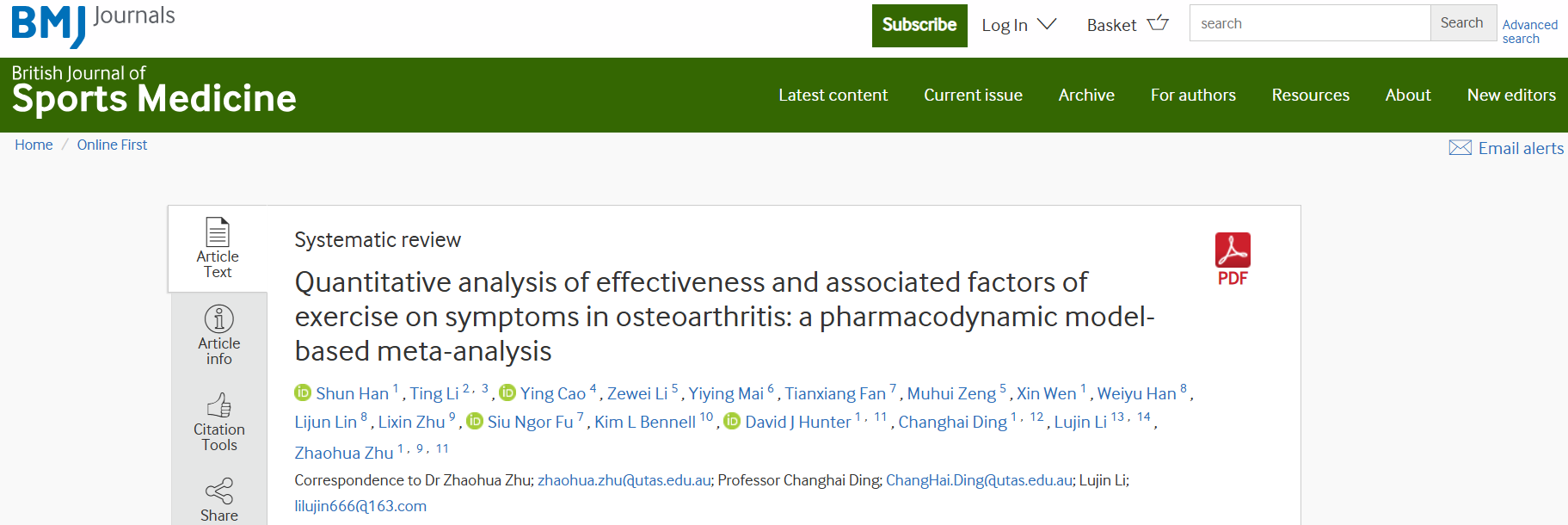 近日,天游ty8线路官网交叉科学研究院郑青山和李禄金团队与南方医科大学珠江医院临床研究中心合作开展的锻炼治疗骨关节炎临床疗效建模研究成果Quantitative analysis of effectiveness and associated factors of exercise on symptoms in osteoarthritis在British Journal of Sports Medicine发表,该刊为英国医学杂志(BMJ)子刊,在运动医学领域排名第一。