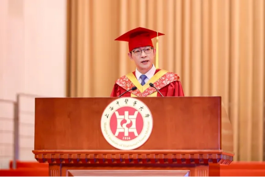 毕业生代表、龙华临床医学院博士研究生原淳淳回顾了自己融入母校发展的成长历程。尽管面临多次拒稿,他仍秉持“于术精处用功,于仁厚处用心”的信念,最终成功在国际权威杂志发表了研究成果,让精准诊疗惠及老年骨病患者,把论文写在祖国大地上。毕业后,他将继续在慢性筋骨病精准诊疗领域践行上中医校训精神,让中医药更好造福百姓健康。