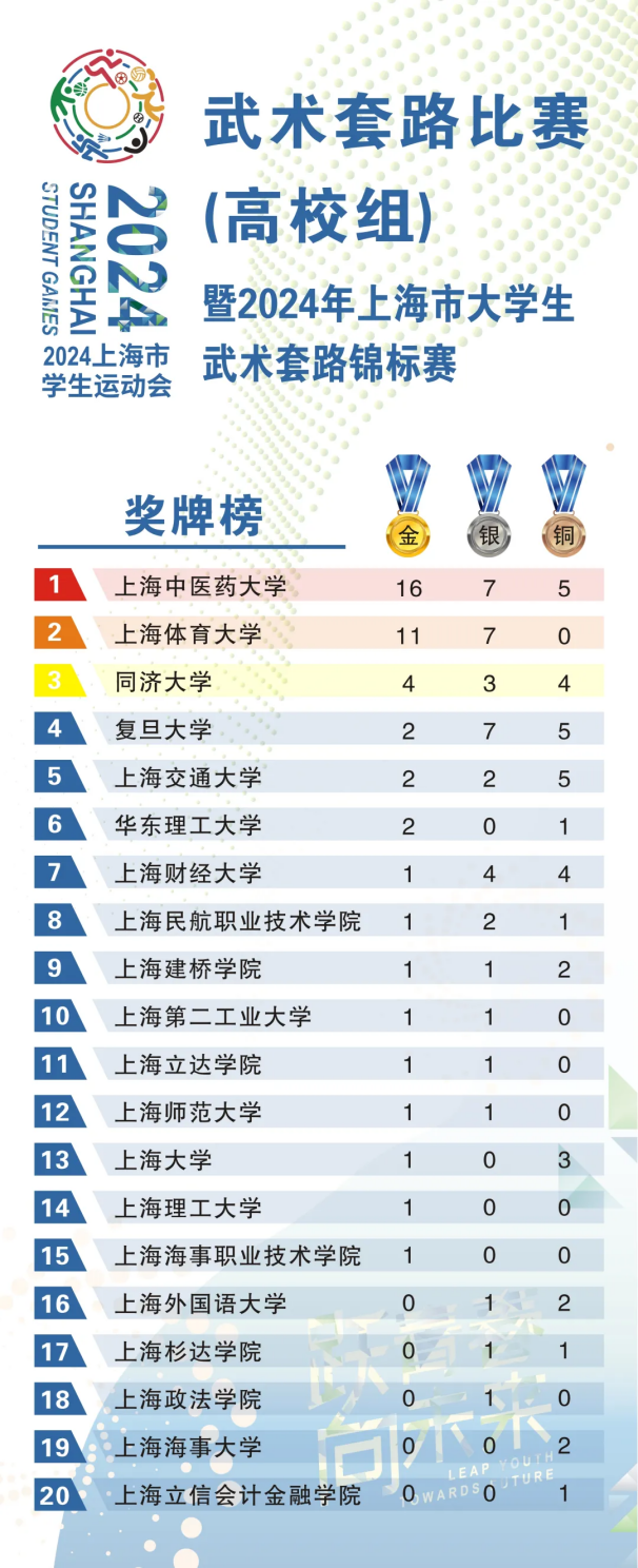 经过一整天的紧张比赛,最终天游ty8线路检测中心登录、上海体育大学和同济大学获团体总分前三名;天游ty8线路官网武术队获16金7银5铜,位列奖牌榜第一名,其中高水平武术队获8金3银5铜,普通生武术队获8金4银。