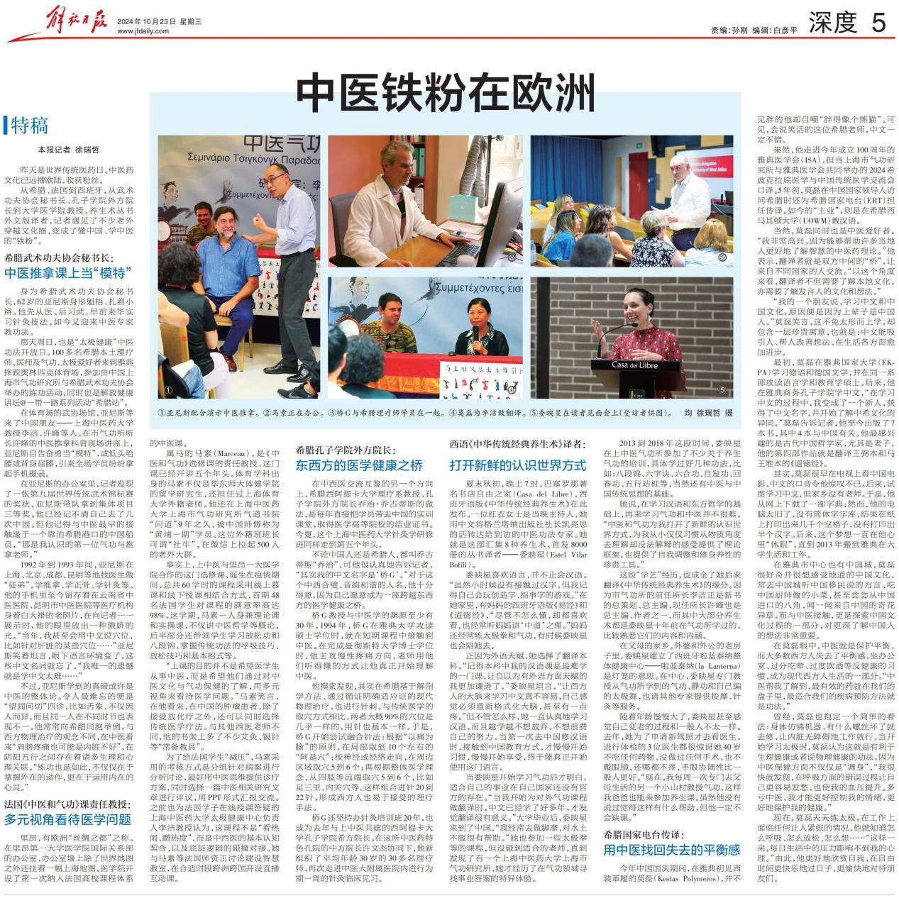 2024年天游ty8线路检测中心登录与解放日报社建立战略合作关系,依托解放健康讲坛,推动海派中医架起“一带一路”健康之桥。记者随天游ty8线路检测中心登录太极健康中心及其上海市气功研究所专家等,赴希腊、法国到西班牙等欧陆文化大国深入采访5位代表性“洋粉丝”,形成有情节有情感有细节的大型人物报道,发掘出因为中医爱上中国,变成了学中医、懂中国的老外“忠粉”,并在各自国度开枝散叶,在周边民众中传扬优秀传统文化,形成中医药文化海外传播的新样本。《解放日报》在第5版“深度”版推出约5000字篇幅的特稿《中医铁粉在欧洲》,解放日报·上观新闻也同步上线发布上、下篇。