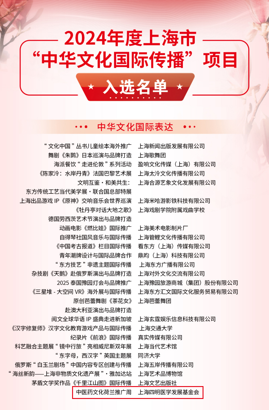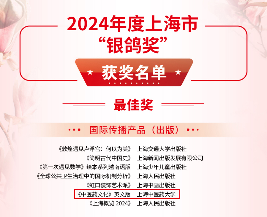 天游ty8线路官网申报的《中医药留学生“周周看上海”国际传播》入选2024年度上海市“中华文化国际传播”项目(国际朋友圈拓展),《中医药文化》英文版荣获2024年度上海市“银鸽奖”国际传播产品(出版)最佳奖。上海四明医学发展基金会申报的《中医药文化荷兰推广周》入选2024年度上海市“中华文化国际传播”项目(中华文化国际表达)。