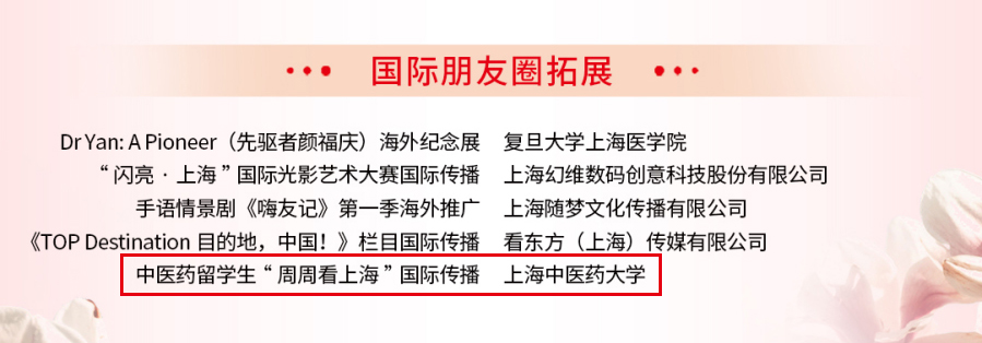 中医药留学生“周周看上海”国际传播项目从中医药留学生视角出发,用留学生的母语讲述他们眼中的上海故事和中医药故事。通过海外自媒体平台,国内主流媒体平台,让世界“看见”和“听见”中医药魅力和上海魅力。截至目前,项目已开展18期“周周看上海”,包括游览上海历史街区、参观中医药文化场馆、体验传统技艺等。同时已制作2部微型纪录片,并在海外平台上线,取得良好效果。通过“走出去”项目,“周周看上海”希望能推动中医药走向世界,用海派中医药文化“圈粉”世界。