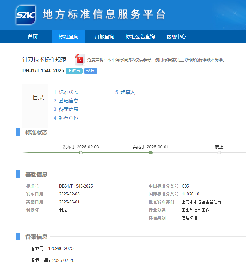 龙华医院胡志俊教授牵头制定的上海地方标准《DB31/T 1540—2025针刀技术操作规范》正式发布
