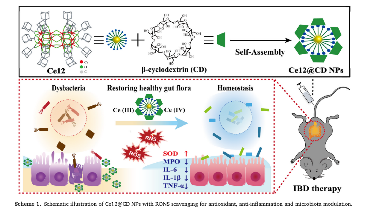 炎性肠病是一种慢性和高复发性疾病,临床上长期药物治疗带来了不良并发症。该研究开发了一种新的纳米药物来治疗炎性肠病:Ce12@CDNPs。它无毒性,稳定性和生物相容性高,容易制备,体外实验显示有效降低了氧化应激产生的ROS水平和各种促炎因子,从而保护细胞免受ROS攻击并维持正常的细胞代谢;体内实验证实通过降低RONS和下调炎症相关的IL-17 TNF、NF-κB、MAPK、JAK-STAT信号通路和ROS相关基因表达,有效缓解了肠道炎症,包括修复肠粘膜屏障和恢复结肠长度;16S rRNA测序证实它通过抑制有害细菌群落和增加有益细菌丰度来重塑肠道微生物群组成。更重要的是,它可以通过肾脏、肝脏和肠道系统有效排泄,确保其治疗应用的安全性。这项研究突出了独特催化活性Ce12@CDNPs在去除RONS和模拟生物酶的特点,展示了其在炎症性疾病的潜在治疗价值。
