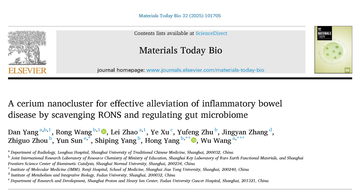 近日,龙华医院航头院区放射科主任医师王武联合上海师范大学资源化学国际联合实验室杨红研究员(通讯作者)带领硕士研究生杨丹、王荣和赵磊技师(第一作者)等团队成员,在Materials Today Bio杂志发表题为A cerium nanocluster for effective alleviation of inflammatory bowel disease by scavenging RONS and regulating gut microbiome的研究论文。