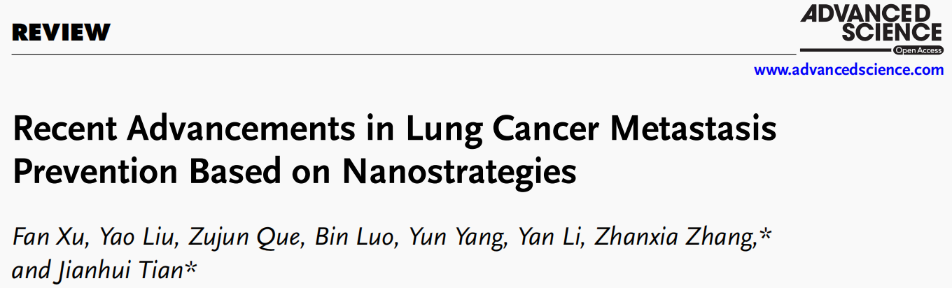 近日,天游ty8线路官网附属市中医医院田建辉教授团队在国际知名学术期刊Advanced Science上发表题为“Recent advancements in lung cancer metastasis prevention based on nanostrategies”的综述。该论文结合肺癌转移的防治现状及面临的挑战,全面总结近年来纳米技术在肺癌转移防治中的最新研究进展,并详细梳理纳米药物的临床转化前景,以期为肺癌转移的防治研究提供新的思路与方向。