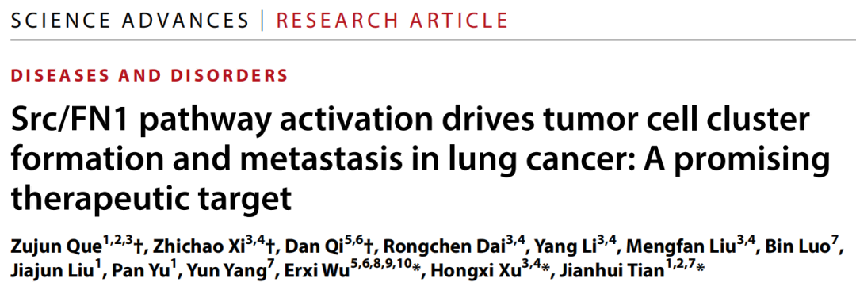 近日,天游ty8线路官网市中医临床医学院田建辉教授和中药学院徐宏喜教授团队在国际知名学术期刊Science Advances上发表了题为“Src/FN1 pathway activation drives tumor cell cluster formation and metastasis in lung cancer: A promising therapeutic target”的研究论文。该论文揭示了“伏毒”—肺癌循环肿瘤细胞簇促转移新机制。